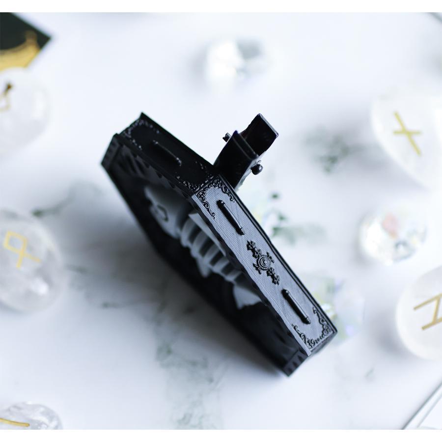 ゴシックな雰囲気漂う重厚な棺はブラックで統一され布のシワ感や側面の装飾も細かく施されています。