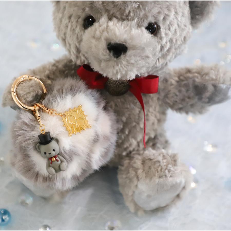 熊のウィンクルくんのふわふわおててとマスコットとRマークのチャームが付いたキーホルダー。