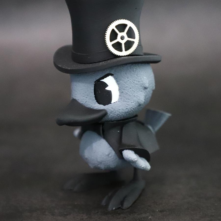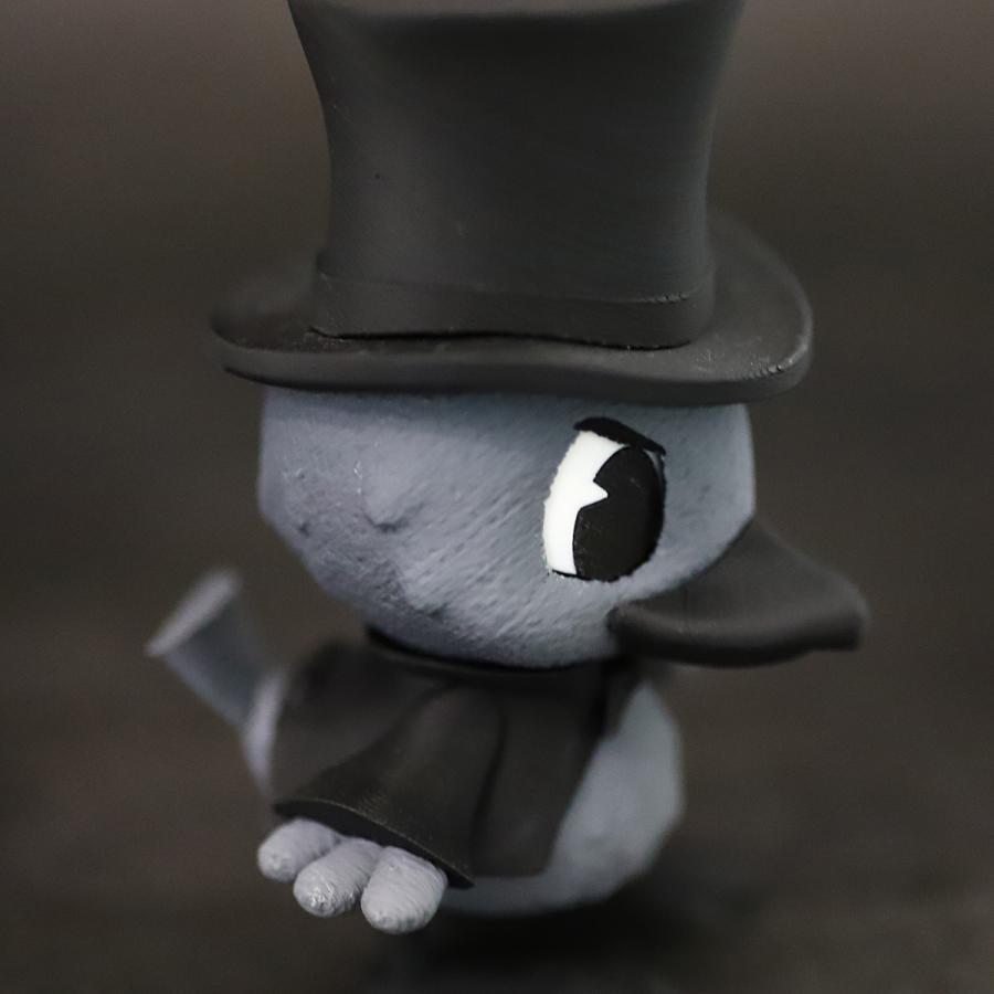 滑車の付いたシルクハットと蝶ネクタイ、ズキンガラスならではの灰色のお腹がポイント。