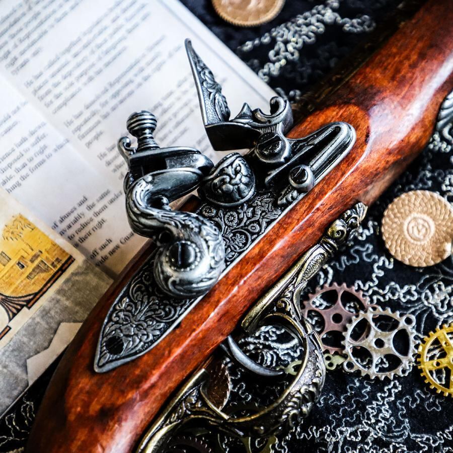 18世紀に海賊たちが最もよく使用した武器の一つであるフリントロックピストル。