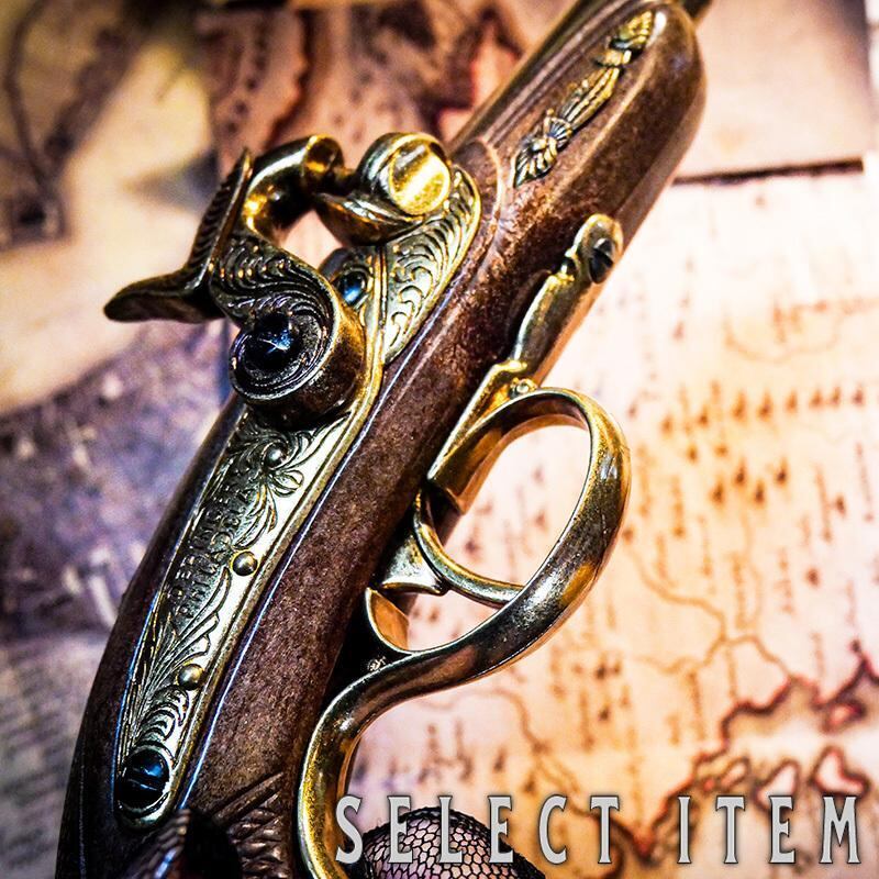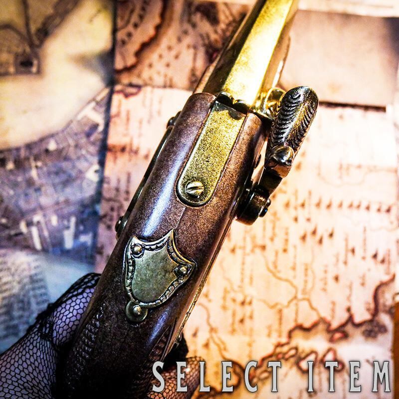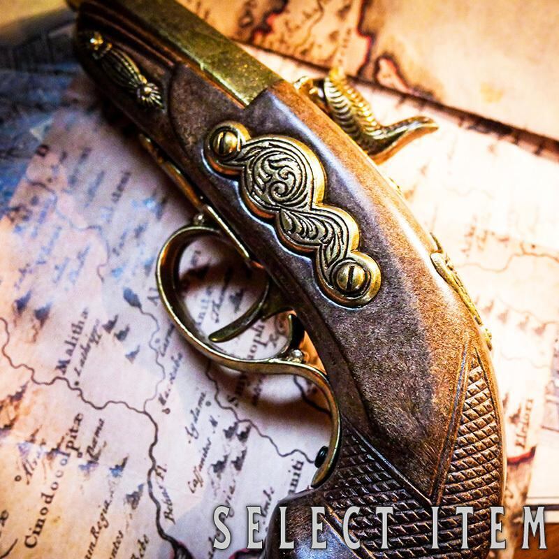 装填と発射の模擬機構を備えたパーカッションピストルのレプリカ。